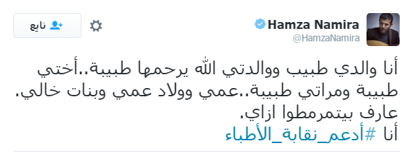 وأشار “نمرة” خلال حسابه بموقع التواصل الاجتماعي “تويتر” إلى علمه بمجهود الطبيب بمصر، لافتًا إلى أن أسرته وعائلته أطباء.