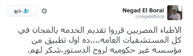 وقدم الحقوقي نجاد البرعي الشكر للأطباء على قرارهم لتقديم الخدمه بالمجان في كل المستشفيات العامة.