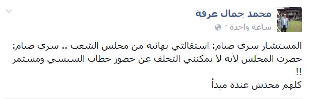 علق الكاتب محمد جمال عرفة عن احتمالية عدول نائب البرلمان سري صيام عن استقالته بقوله: “كلهم محدش عنده مبدأ”؛ حيث قال في منشور له على “فيس بوك”: “المستشار سري صيام: استقالتي نهائية من مجلس الشعب.. سري صيام: حضرت المجلس لأنه لا يمكنني التخلف عن حضور خطاب السيسي ومستمر !!كلهم محدش عنده مبدأ”.