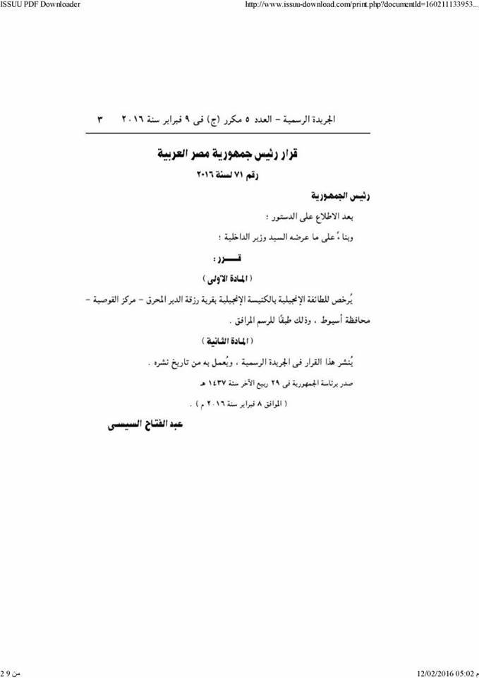 أصدر عبدالفتاح السيسي، قرارا بترخيص إنشاء كنيسة للطائفة الإنجيلية في قرية رزقة الدير المحرق، بمركز القوصية بأسيوط، وذلك طبقا للرسم المنشور في الجريدة الرسمية