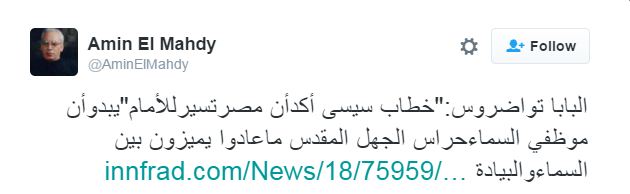 وعلق مغردون على تصريحات “تواضروس” بأن مصر تسير للأمام، بتعليقات ساخرة، وكان من بينها.. حمد ماهر: البابا تواضروس: خطاب السيسي أكد أن مصر تسير للأمام.. دايما فيه ناس بتنصحني إني ما استخدمش ألفاظ بذيئة طب ده يتقال له ايه؟؟