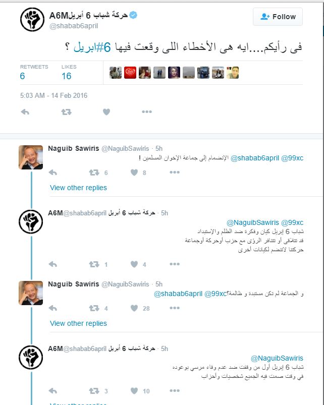نشب جدال بين رجل الأعمال المصري نجيب ساويرس وحركة شباب 6 أبريل، حول انضمامهم لجماعة الإخوان المسلمين، وذلك عبر صفحات موقع التغريدات القصيرة “تويتر”.
