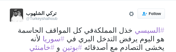 وأضاف في تغريدة عبر حسابه على موقع التدوين المصغر “تويتر” أن السيسي رفض التدخل البري في سوريا خشية التصادم مع أصدقائه بوتين وخامنئي.