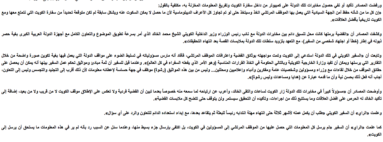 كما علمت “الرأي” أن السفير “لم يرسل كل المعلومات التي حصل عليها من الموظف المرتشي إلى المسؤولين في الكويت، بل اكتفى بإرسال جزء بسيط منها، وعندما سئل عن السبب رد بأنه لم ير في هذه المعلومات ما يستحق أن يرسل إلى الكويت”.