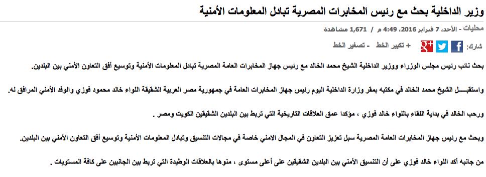 ونشرت الجريدة ذاتها في وقت سابق لنشر الخبر خبرًا آخر يتحدث عن استقبال الشيخ محمد الخالد في مكتبه بمقر وزارة الداخلية، رئيس جهاز المخابرات العامة في جمهورية مصر العربية اللواء خالد محمود فوزي والوفد الأمني المرافق له.