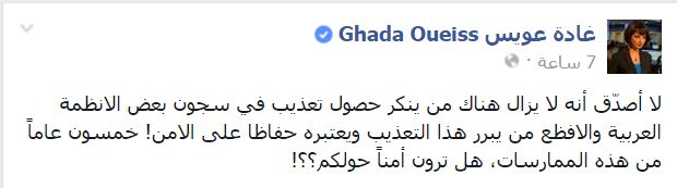 انتقدت الإعلامية اللبنانية بقناة "الجزيرة"، غادة عويس، استمرار التعذيب في سجون بعض الأنظمة العربية، معربة عن دهشتها ممن ينكر وجودها أو يبررها بغرض الحفاظ على الأمن.