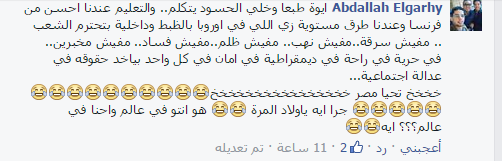 -abdallah: “ايوه طبعا وخلي الحسود يتكلم.. والتعليم عندنا احسن من فرنسا وعندنا طرق مستوية زي اللي في اوروبا بالظبط وداخلية بتحترم الشعب، مفيش سرقة ، مفيش نهب ، مفيش ظلم ، مفيش فساد….”.
