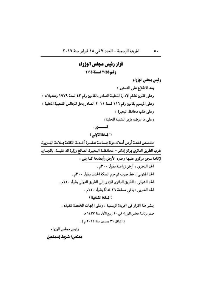 نشرت الجريدة الرسيمة لجمهورية مصر العربية، اليوم الخميس، قرارا صادرا من مجلس الوزراء برئاسة المهندس شريف إسماعيل، بإنشاء سجن جديد في محافظة البحيرة.