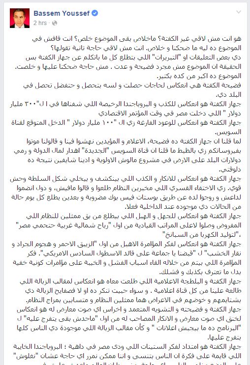 كشف مقدم البرامج الساخر الدكتور باسم يوسف، سر اهتمامه بجهاز الكفتة الذي سبق وأعلن الجيش عنه، وذلك خلال منشور نشره عبر صفحته الرسمية بموقع التواصل الاجتماعي “فيس بوك”.