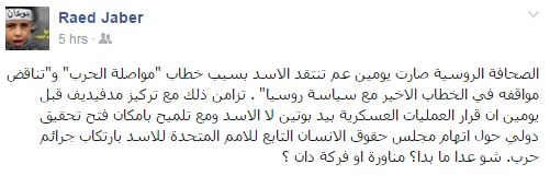 أكد مدير مكتب صحيفة “الحياة” بموسكو، رائد جبر، تصريحات رئيس النظام السوري بشار الأسد حول مواصلة الحرب، أنّ روسيا فوجئت بخطاب “أحمق” أحرجها.
