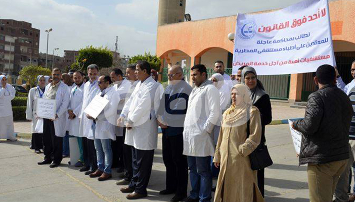 وفي السياق نفسه، نظمت نقابة أطباء الإسماعيلية، اليوم، وقفة تضامنية مع أطباء المطرية، بساحة مستشفى الإسماعيلية العام.