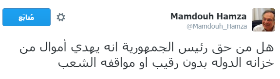 وأضاف حمزة قائلا “هل من حق رئيس الجمهورية أن يهدي أموال من خزانة الدولة بدون رقيب أو موافقة للشعب”.