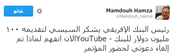 وقال ممدوح حمزة في تغريدة له عبر حسابه الشخصي بتويتر “رئيس البنك الإفريقي يشكر السيسي  لتقديمه 100 مليون دولار للبنك”.