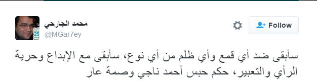 اعتبر الكاتب الصحفي محمد الجارحي، أن حبس الروائي أحمد ناجي بتهمة خدش الحياء بمثابة وصمة عار، حيث قال في تغريدة له على "تويتر": "سأبقى ضد أي قمع وأي ظلم من أي نوع، سأبقى مع الإبداع وحرية الرأي والتعبير، حكم حبس أحمد ناجي