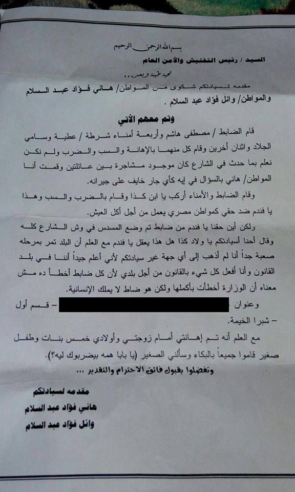 وتقدم هاني ببلاغ ضد الضابط وأمناء الشرطة على نسخة منه، وأضافت ابنة المجني عليه: “إحنا سمعنا الضابط بيقول خدوا الناس دي وسيبوا الناس اللي عملت المشكلة، خشوا بدل ما نمد أيدينا عليك، وضربوا بابا على بقه ومناخيره، ولما عمي حاول يدافع عن بابا برضه ضربوه وخدوا جدي كمان”.