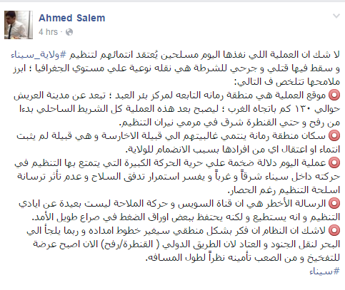 واستنتج أستاذ البيولوجي أن التنظيم يملك حرية الحركة بشكل كبير داخل سيناء شرقًا وغربًا، لافتًا إلى أن تلك العملية تُفسر استمرار تَدفق السلاح، وعدم تأثر ترسانة أسلحة التنظيم رغم الحصار.