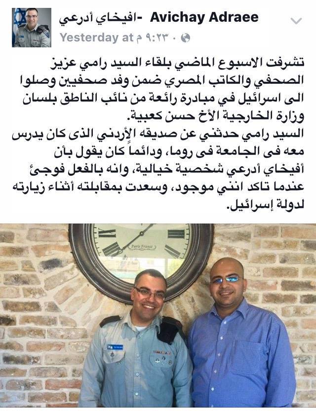 ونشر “أدرعي” صورة جمعته بالصحفي المصري رامي عزيز المقيم في أوروبا، وقال “: تشرفت الأسبوع الماضي بلقاء السيد رامي عزيز الصحفي والكاتب المصري ضمن وفد صحفيين وصلوا إلى إسرائيل”.