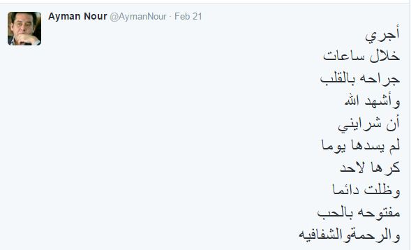 غادر الدكتور أيمن نور، مؤسس حزب غد الثورة، غرفة العمليات، بعد تركيب دعامات خلال جراحة أجراها بالقلب.
