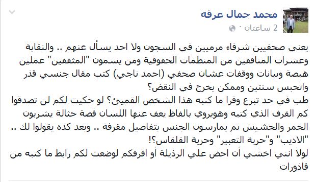 أعرب الكاتب محمد جمال عرفة عن دهشته من تضامن العديد من المثقفين والكتاب مع الكاتب الصحفي أحمد ناجي، لحبسه بعد كتابته مقالا جنسيا، بينما غيره من الصحفيين في المعتقلات دون تضامن.