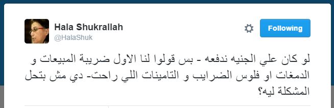 وقالت شكر الله في تغريدتها عبر حسابها الشخصي، بموقع التغريدات القصيرة “تويتر”: “لو كان على الجنيه ندفعه، وذلك في إشارة إلى طالب السيسي من المصريين، بدفع جنيه يوميا من أجل مصر”.