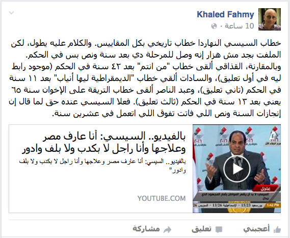 وأضاف “فهمي”، في منشور له بصفحته على موقع التواصل الاجتماعي ” فيس بوك”، أن الكلام عن خطاب السيسي يطول، لكن الملفت بجد مش هزار إنه وصل للمرحلة دي بعد سنة ونص بس في الحكم.