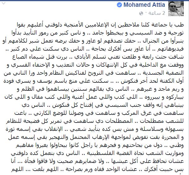 وأضاف “الناس دي سكتت على منع باسم يوسف ويسري فودة وريم ماجد وغيرهم.. الناس دي بقالهم سنتين بيساهموا في الظلم وبيباركوه وبيبرروه.. اللي كدب واللي عمل أغنية واللي كتب مقال واللي كان بيتباهى إنه واقف جنب السيسي في افتتاح كل فنكوش.. الناس دي ساهمت في غرق المركب وساهمت في وصولنا للوضع الكارثي.. باعت للشعب مصطلحات.. المصطلحات دي ساهمت في تمرير كل فضيحة للنظام بسهولة وسلاسلة ومش بس كده بتأييد شعبي”.