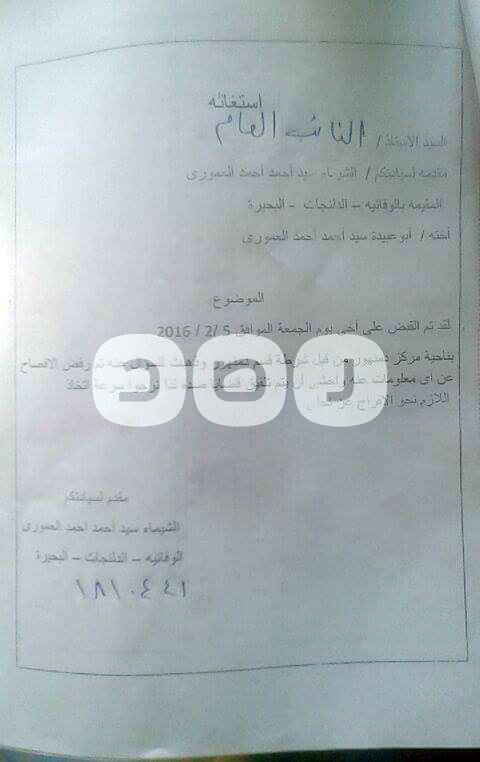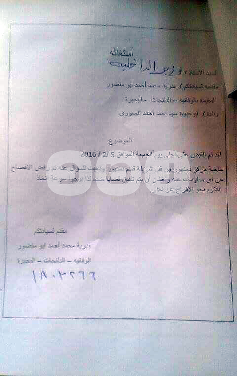 “رصد” حصلت على صور من فاكسات للنائب العام وتليغرافات لوزارة الداخلية تفيد اختطاف أبو عبيدة سيد أحمد العموري، البالغ من العمر 28 عامًا يوم 5/2/2016، وهو أحد المتهمين في هذه الخلية، وقد تم إرسال هذه الفاكسات والتليغرافات من قبل أهل المختطف، بعد علمهم من قبل شاهد عيان أبلغهم بواقعة الاختطاف.