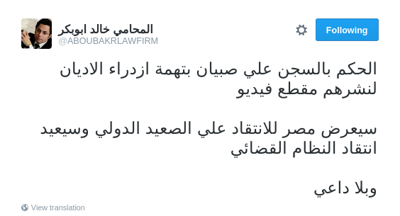 وقال -عبر تغريدة له على “تويتر”-: “الحكم بالسجن على صبيان بتهمة ازدراء الأديان لنشرهم مقطع فيديو سيعرض مصر للانتقاد على الصعيد الدولي وسيعيد انتقاد النظام القضائي، وبلا داعٍ”.