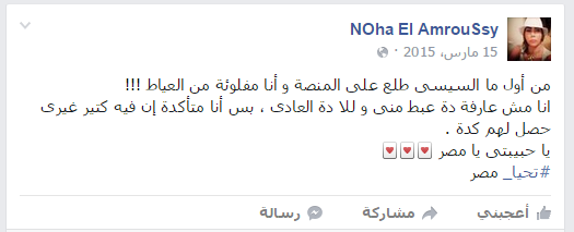 عرفت “العمروسي” بتأييدها للسيسي، ونشرت ذلك على صفحتها الشخصية على “فيس بوك”.