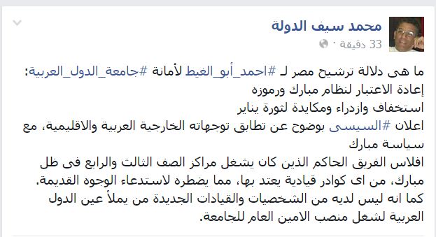 قال محمد سيف الدولة، الخبير في الشأن القومي والعربي، إن التفكير في ترشيح مصر لأحمد أبو الغيط لأمانة ‫‏جامعة الدول العربية، له عدة دلالات؛ أهمها إعادة الاعتبار لنظام مبارك ورموزه، واستخفاف وازدراء ومكايدة لثورة يناير.. إعلان ‫‏السيسي بوضوح عن تطابق توجهاته الخارجية العربية والإقليمية، مع سياسة مبارك.
