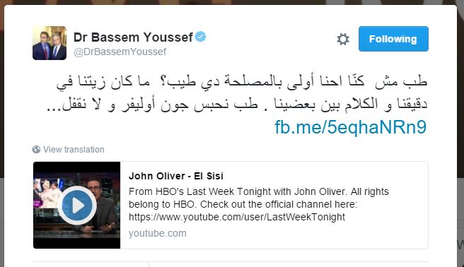 علق مقدم البرامج الساخر باسم يوسف على سخرية مقدم البرامج الغربي جون أوليفر من عبدالفتاح السيسي، وذلك من خلال تغريدة نشرها عبر حسابه الشخصي بموقع التغريدات القصيرة “تويتر”.