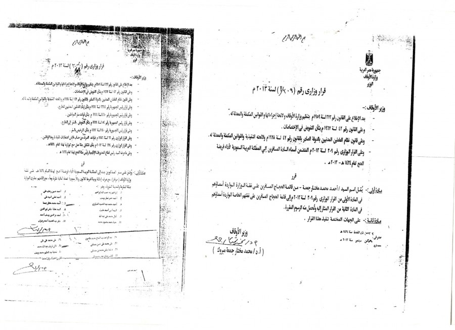 وجاء في القرار الوزاري رقم 309 لسنة 2013 أنه بعد الاطلاع على القانون رقم 122 لسنة 1951 بشأن وزارة الأوقاف ولائحتها المنظمة لها وعلى القانون رقم 42 لسنة 1967 بشأن التفويض في الاختصاصات وعلى نظام العاملين المدنين بالدولة بالقانون رقم 42 لسنة 1928 وعلى مجموعة قوانين أخرى منها على القرار الوزاري رقم 274 لسنة 2013 بشأن تشكيل بعثة عمل حج الوزارة للعام الهجري 1434، فإن وزير الأوقاف مختار جمعة قرر الموافقة على سفر المذكورين إلى المملكة العربية السعودية لأداء فريضة الحج لهذا العام 1434 هجريًا على نفقة وزارة الأوقاف “حوافز” مع التوصية بصرف إعاشة يومية قدرها ثلاثون ريالًا سعوديًا لمدة ثمانية عشر يومًا مع إقامتهما بمقري الوزارة بمكة المكرمة والمدينة.