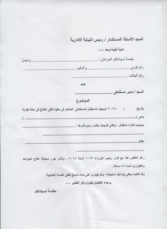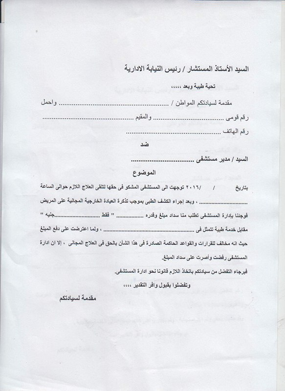 عرضت نقابة أطباء مصر -عبر موقعها الإلكتروني- نماذج مطبوعة لشكاوى يمكنك تقديمها للنيابة الإدارية في حالة إجبار المواطن على دفع رسوم غير قانونية في المستشفيات الحكومية مع إرفاق صورة من الإيصال الذي قام بتسديد الرسوم بموجبه بالمخالفة لقرار السيد رئيس الوزاراء بالعلاج المجاني.