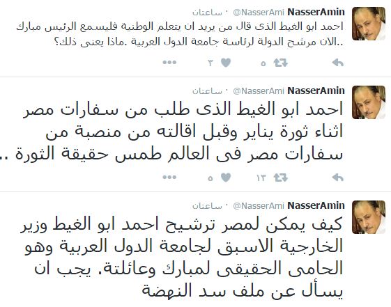 وتساءل -عبر عدة تغريدات له على “تويتر”-: “كيف يمكن لمصر ترشيح أحمد أبو الغيط، وزير الخارجية الأسبق، لجامعة الدول العربية، وهو الحامي الحقيقي لمبارك وعائلته، يجب أن يُسأل عن ملف سد النهضة”.