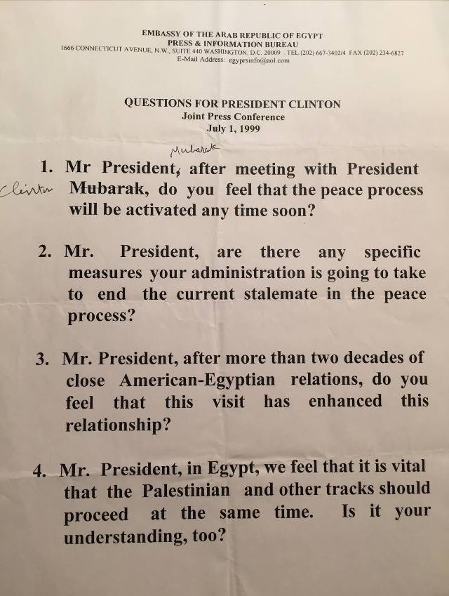 وأضاف “منصور”، “وكان كل الصحفيين المصريين يلتزمون بهذه الأسئلة السطحية العامة والتي تمس عادة إما وضع عملية السلام أو العلاقات الثنائية (زي ما أنتم شايفين في النسخة اللي تحت من مؤتمر 1 يوليو 1999)”.