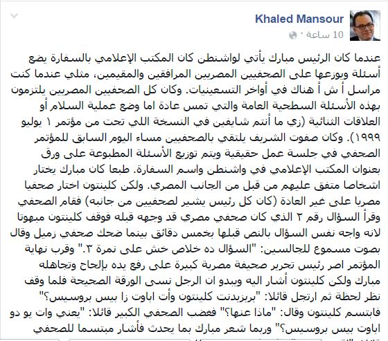 واستطرد “منصور” قائلًا: “طبعًا كان مبارك يختار أشخاصًا متفق عليهم من قبل من الجانب المصري. ولكن كلينتون اختار صحفيًا مصريًا على غير العادة (كان كل رئيس يشير لصحفيين من جانبه) فقام الصحفي وقرأ السؤال رقم 2 الذي كان صحفي مصري قد وجهه قبله فوقف كلينتون مبهوتًا لأنه واجه السؤال نفسه بالنص قبلها بخمس دقائق، بينما ضحك صحفي زميل وقال بصوت مسموع للجالسين: “السؤال ده خلاص خش على نمرة 3”.