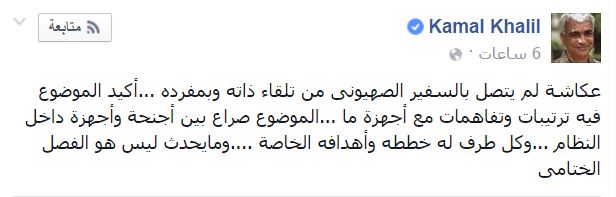 وأضاف -في منشور له عبر صفحته الشخصية بموقع التواصل الاجتماعي “فيس بوك”- “عكاشة لم يتصل بالسفير الصهيوني من تلقاء ذاته وبمفرده… أكيد الموضوع فيه ترتيبات وتفاهمات مع أجهزة ما”، مضيفًا “الموضوع صراع بين أجنحة وأجهزة داخل النظام.. وكل طرف له خططه وأهدافه الخاصة، وما يحدث ليس هو الفصل الختامي”.