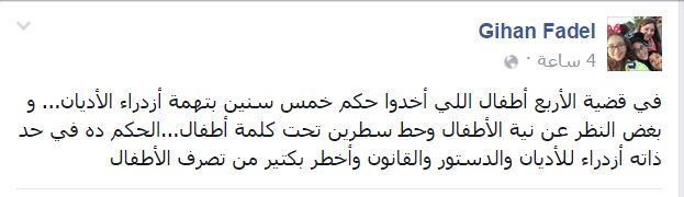 وقالت -في منشور لها على “فيس بوك”-: “في قضية الأربع أطفال اللي أخدوا حكم خمس سنين بتهمة ازدراء الأديان… وبغض النظر عن نية الأطفال وحط سطرين تحت كلمة أطفال… الحكم ده في حد ذاته ازدراء للأديان والدستور والقانون وأخطر بكتير من تصرف الأطفال”.