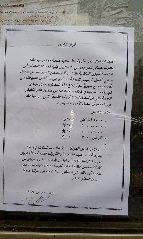 وجاء في القرار: “نظرًا لخسائر المصنع التي تقدر بنحو 3 ملايين جنيه وتوقف مصانع السيارات عن العمل ما أدى إلى انخفاض المبيعات إلى أقل من الربع وارتفاع تكاليف المياه والضرائب والكهرباء، سيتم تخفيض الرواتب بالشكل التالي: أقل من 2000 جنيه 15%، من 2000 إلى 4000 خصم 20%، من 4000 إلى 6000 25%، 6000 فما أكثر 30%”.