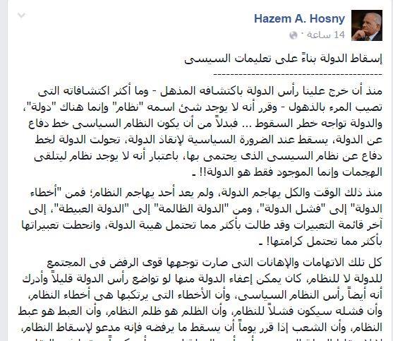 وأضاف -عبر منشوره عبر “فيس بوك” والذي يحمل عنوان “إسقاط الدولة بناءً على تعليمات السيسي”- “منذ ذلك الوقت والكل يهاجم الدولة، ولم يعد أحد يهاجم النظام؛ فمن “أخطاء الدولة” إلى “فشل الدولة”، ومن “الدولة الظالمة” إلى “الدولة العبيطة”، إلى آخر قائمة التعبيرات وقد طالت بأكثر مما تحتمل هيبة الدولة، وانحطت تعبيراتها بأكثر مما تحتمل كرامتها!”.