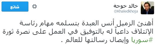 وهنَّأ خالد خوجة المنتهية ولايته الرئيس الجديد للائتلاف، في تغريدة له عبر حسابه الرسمي على موقع التواصل الاجتماعي “تويتر” قائلاً: “أهنئ الزميل أنس العبدة بتسلمه مهام رئاسة الائتلاف، داعيًا له بالتوفق في العمل على نصرة ثورة سوريا، وإيصال رسالتها للعالم”.