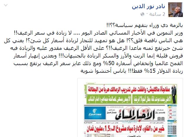 وتساءل -عبر منشور له على “فيس بوك”-: “هي الناس ناقصة قلق؟؟! هل هو تمهيد للتجار لزيادة أسعار كل شيء؟!، يعني كل شيء حيرتفع ثمنه ما عدا الرغيف!!؟”.