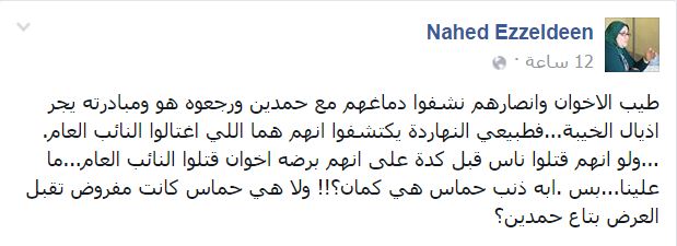 وأضافت “عز الدين” ساخرة “ولو انهم قتلوا ناس قبل كده على إنهم برضه إخوان قتلوا النائب العام… ما علينا… بس إيه ذنب حماس هي كمان؟!! ولا هي حماس كانت مفروض تقبل العرض بتاع حمدين؟”.