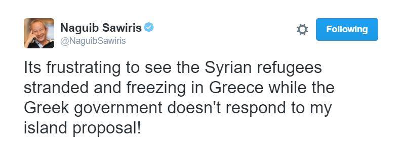 أعاد رجل الأعمال نجيب ساويرس، طرح عرضه على الحكومة اليونانية لشراء جزيرة وجعلها للاجئين السوريين، معربًا عن أسفه لما يعانونه في اليونان.