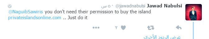 – “جواد نابلسي”: “لست بحاجة إلى إذن منهم لشراء الجزيرة، فقط ادخل على هذا الموقع المخصص لبييع الجزر” privateislandonline.com” فقط افعلها.
