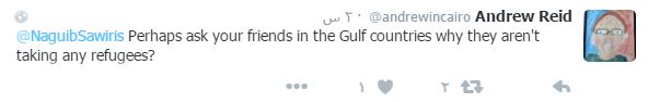 – “أندرو ريد”: “ربما تسأل أصدقاءك في الدول الخليجية لماذا لا يستضيفون أي لاجئ؟”.