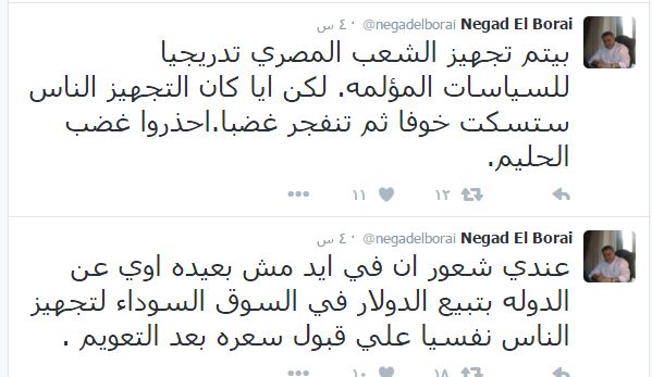 وأضاف “البرعي” -عبر تغريدة أخرى- “عندي شعور إن في إيد مش بعيدة أوي عن الدولة بتبيع الدولار في السوق السوداء لتجهيز الناس نفسيًا على قبول سعره بعد التعويم”.