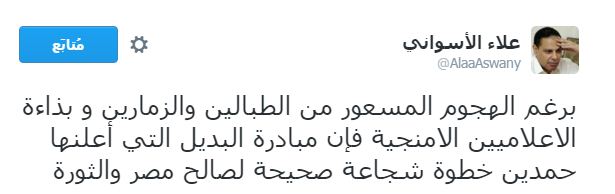 وهاجم المغردون علاء الأسواني؛ بعد ثنائه على مبادرة “صباحي”، مشيرين إلى أنه بذلك انضم إلى صفوف خائني الوطن والمعتقلين، وكان من بين التعليقات؛