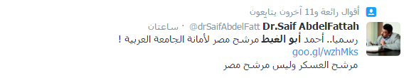 وقال نائب الأمين العام للجامعة العربية السفير أحمد بن حلي في تصريح له: “إن الأمانة العامة للجامعة قامت بتعميم المذكرة المصرية على الدول الأعضاء بالجامعة بشأن المرشح المصري”.
