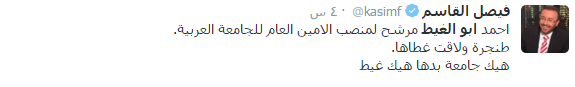 وقال القاسم خلال تغريدة على حسابه بموقع التدوين الصغر “تويتر”: “أحمد أبوالغيط مرشح لمنصب الأمين العام للجامعة العربية، طنجرة ولاقت غطاها، هيك جامعة بدها هيك غيط”.